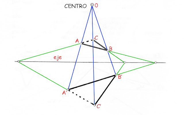 1/ Los puntos homólogos están situados en lineas rectas (azules) que confluyen en un punto que se llama "0" centro de homología.